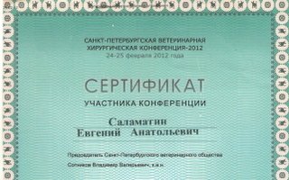 2012 — Курган — Прошел цикл тематического усовершенствования по теме «Чрескостный остеосинтез в ветеринарной травматологии и ортопедии