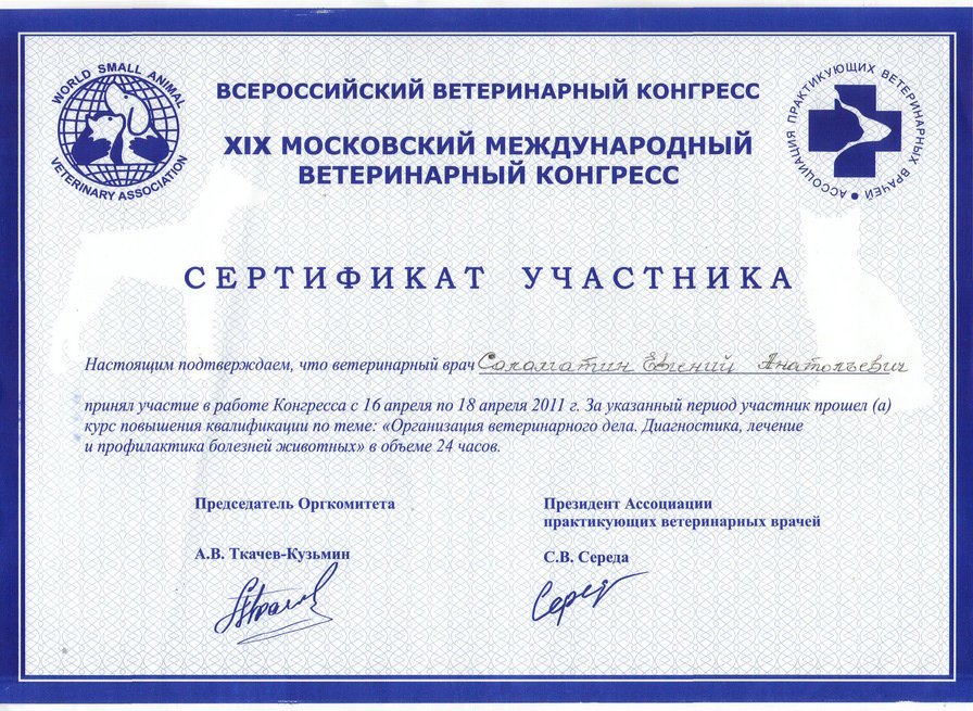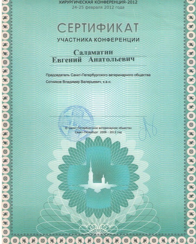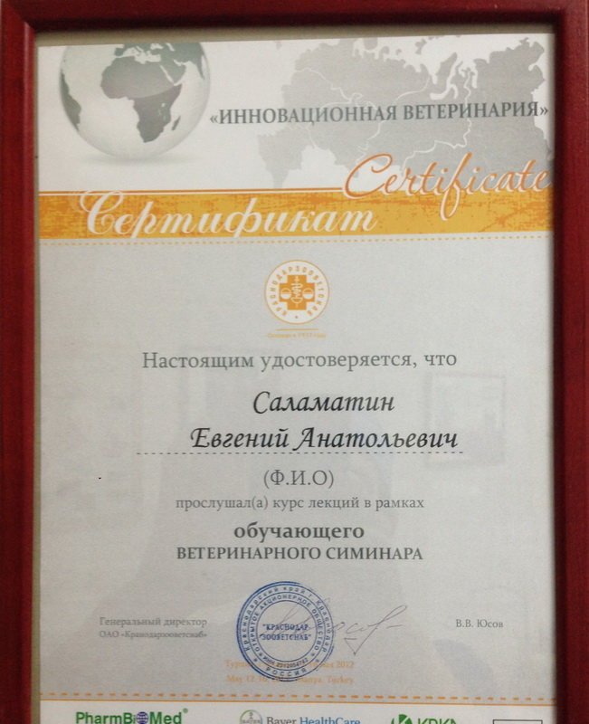 2012 — Курган — Прошел цикл тематического усовершенствования по теме «Чрескостный остеосинтез в ветеринарной травматологии и ортопедии