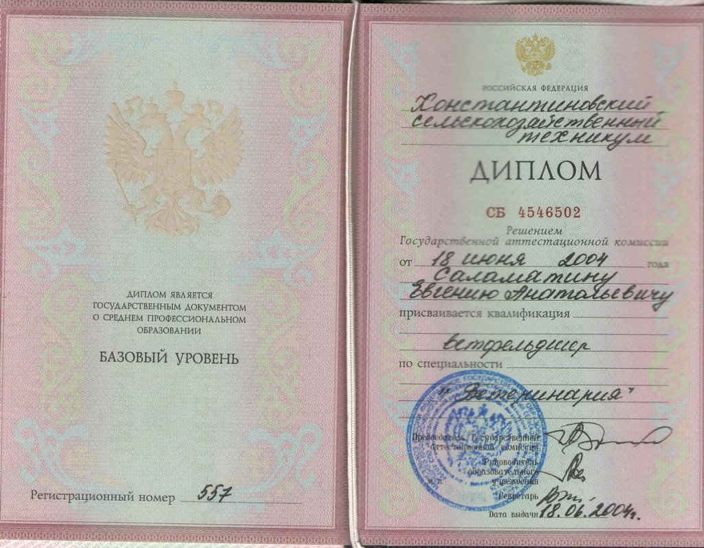 2004 — Константиновский сельскохозяйственный техникум по специальности «Ветеринарный фельдшер»
