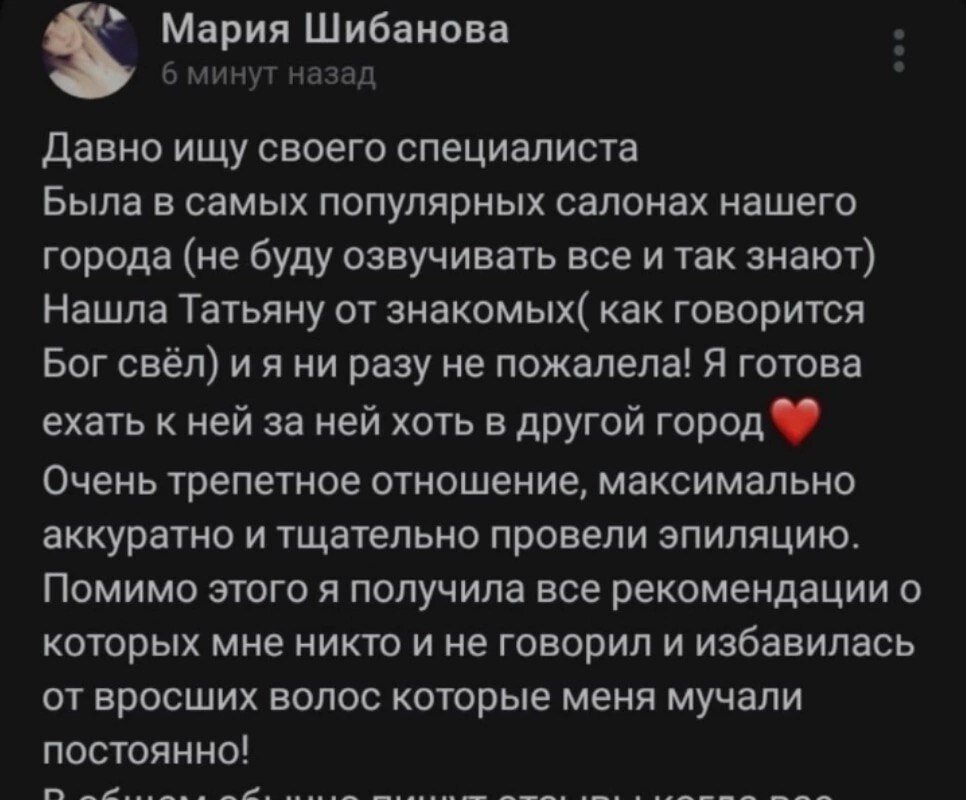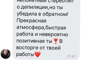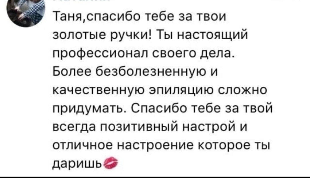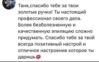 Хочу сказать спасибо мастеру по эпиляции -Татьяне. Быстро, качественно и с комфортом