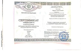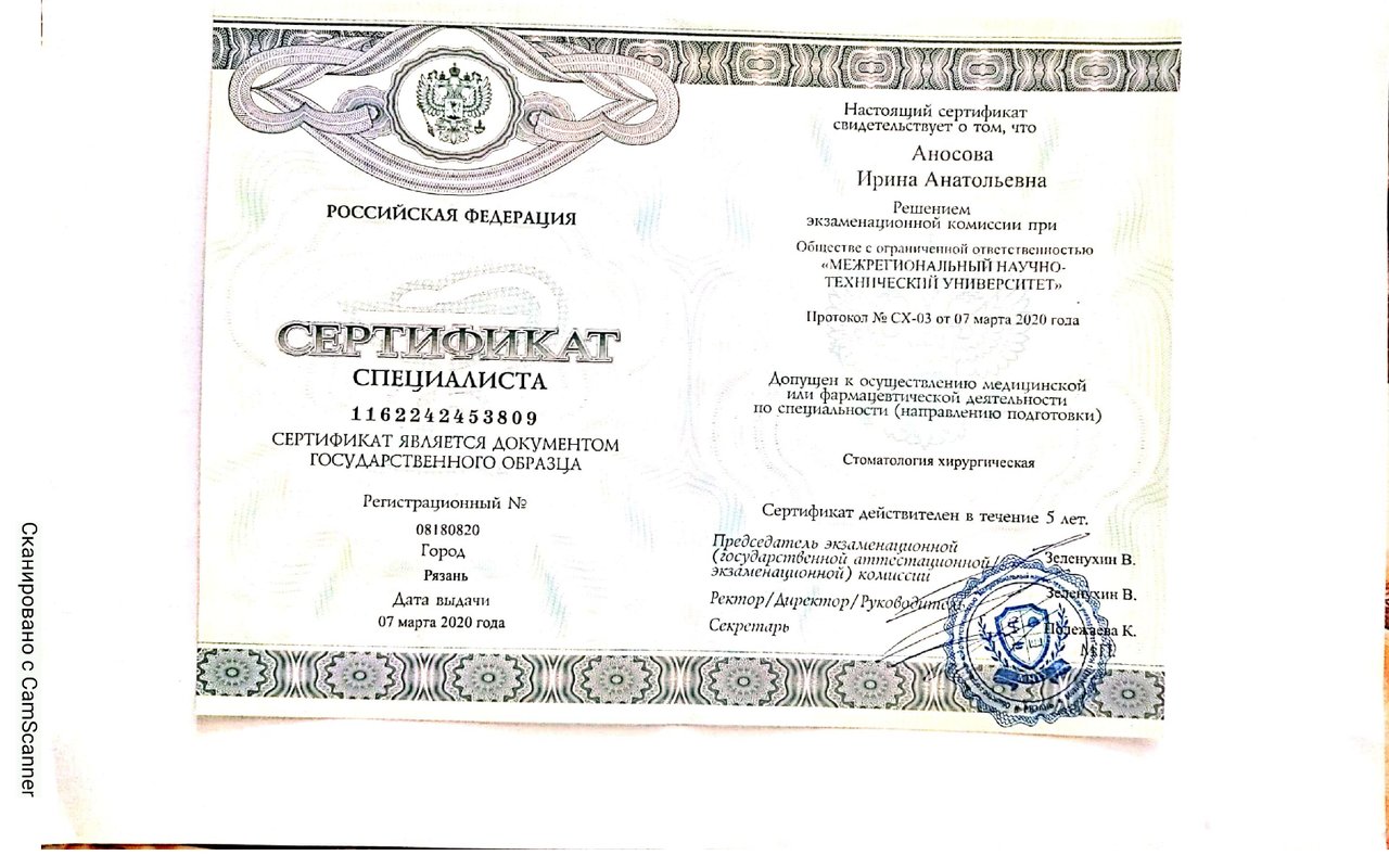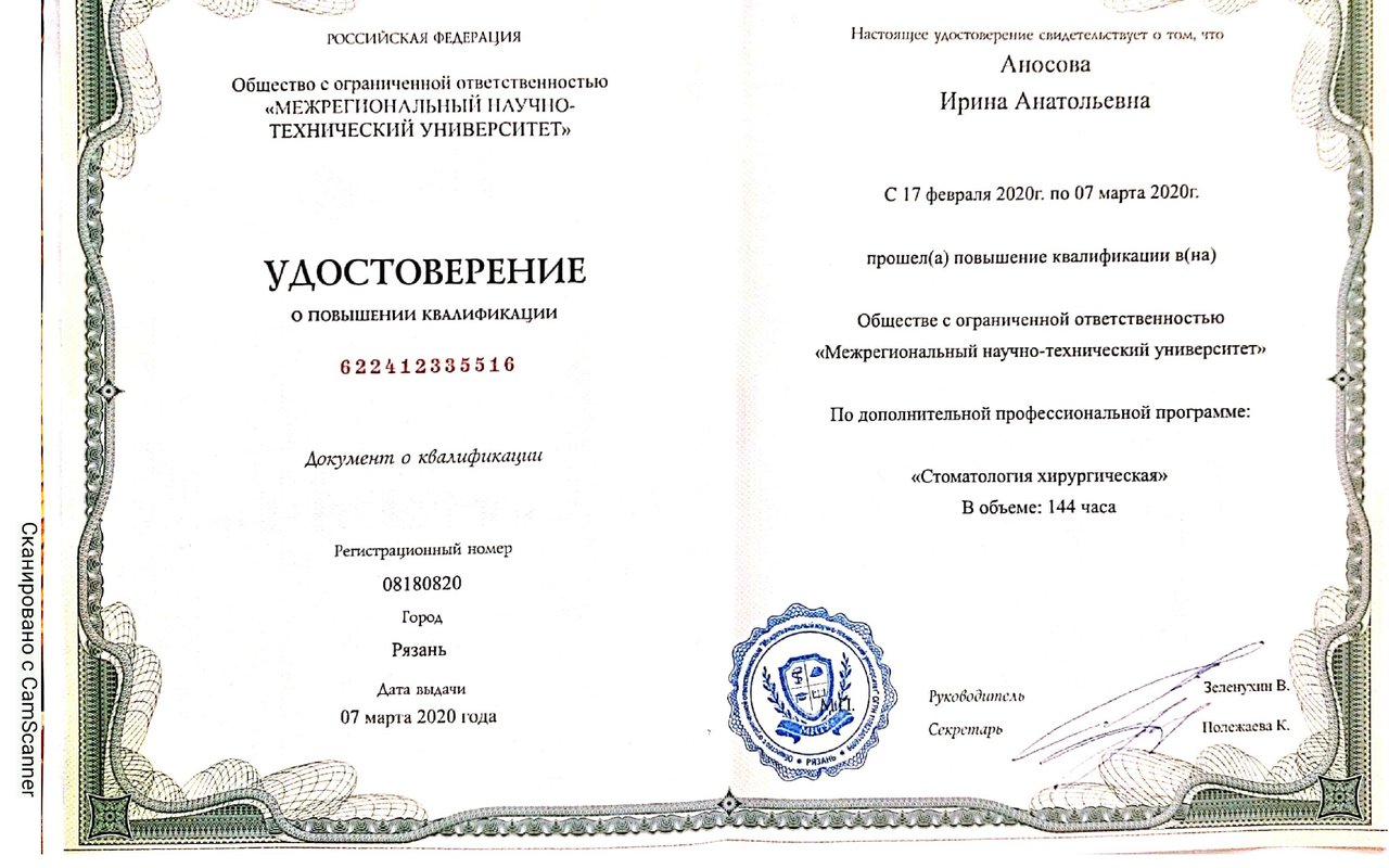 2020 — Стоматология хирургическая. Сертификат специалиста. Общество с ограниченной ответственностью «Межрегиональный научно-технический университет»