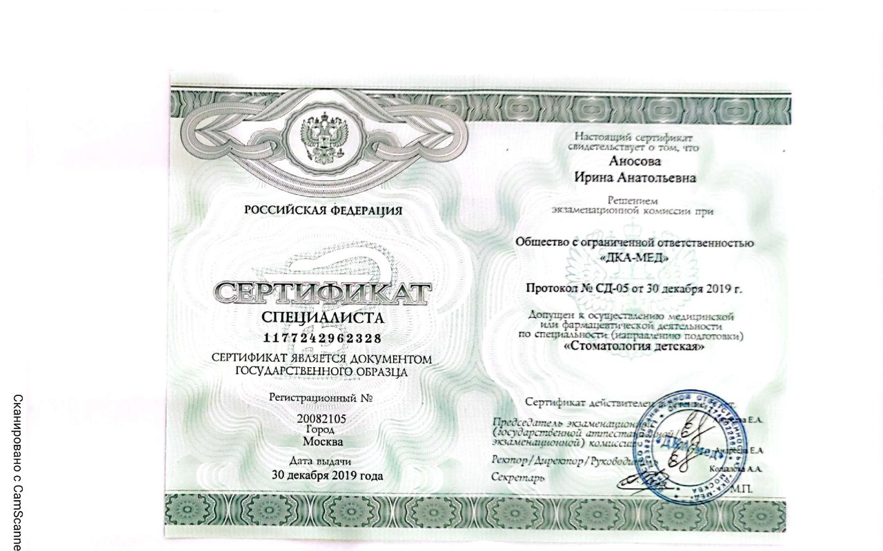 2019 — Стоматология детская. Сертификат специалиста. Общество с ограниченной ответственностью «ДКА-МЕД»