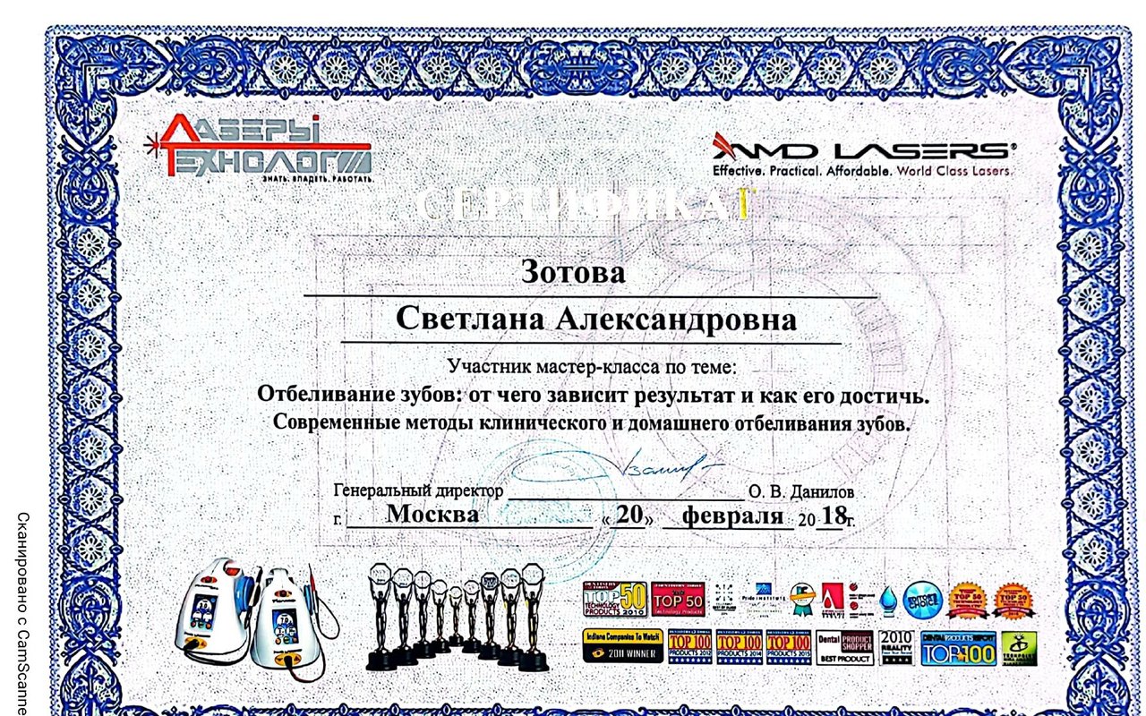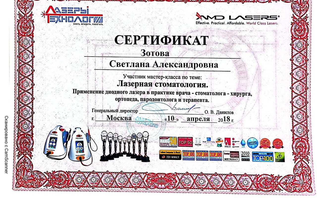 Зотова Светлана Александровна является стоматологом-терапевтом. Светлана Зотова в том числе занимается лечением лечение стоматита, пульпита и кариеса, выполняет удаление зубов и снятие зубного камня, а также проводит профессиональную гигиену полости рта. Вы можете обратиться к дантисту не только если вас беспокоит состояние зубов, но также при болезнях полости рта.