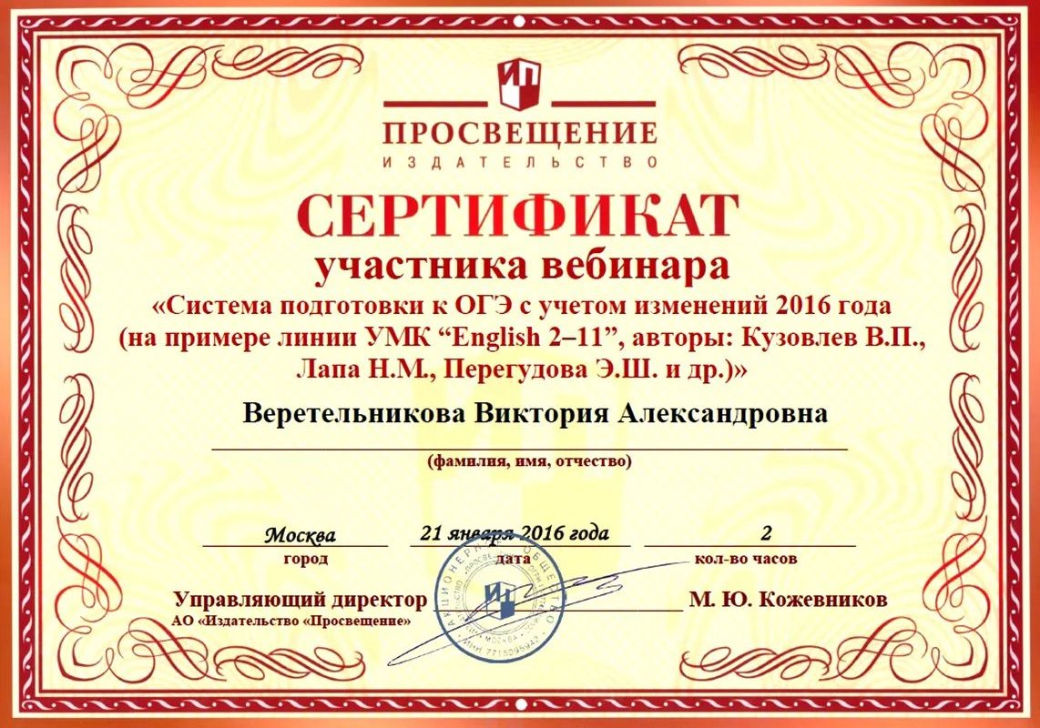 2015 — Институт непрерывного образования РГУ им. С.А. Есенина, дополнительная квалификация – переводчик в сфере профессиональной коммуникации (английский язык)