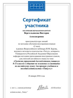 Её дополнительная специализация - подготовка к сдаче итоговых экзаменов по английскому (ЕГЭ, ГИА) и немецкому (ЕГЭ и ГИА).