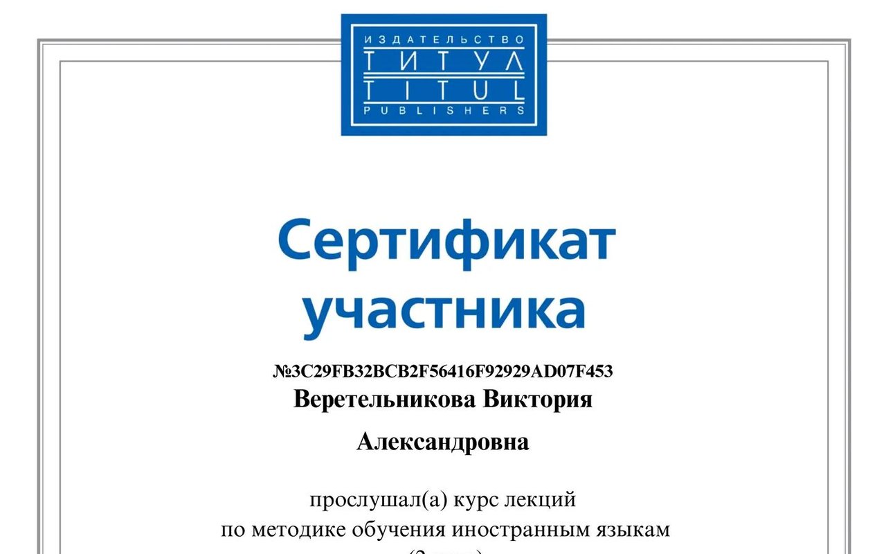 Английский язык считается общепринятым во всём мире языком. Желаете начать говорить по-английски увереннее, а ограничиться только несложными конструкциями - не в вашем стиле? Веретельникова Виктория поможет в освоении английского, ведь несмотря на то, что Интернет пестрит материалами для его изучения, самому овладеть этим языком под силу не всем: результат появляется не сразу, вызубренное трудно усваивается. Репетитор составит методику обучения, ориентируясь на ваш уровень, поможет достичь необходимых результатов и, что немаловажно, создаст все условия, чтобы занятия были в радость. Она преподаёт разговорный английский, английский для бизнеса.