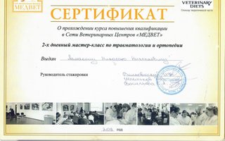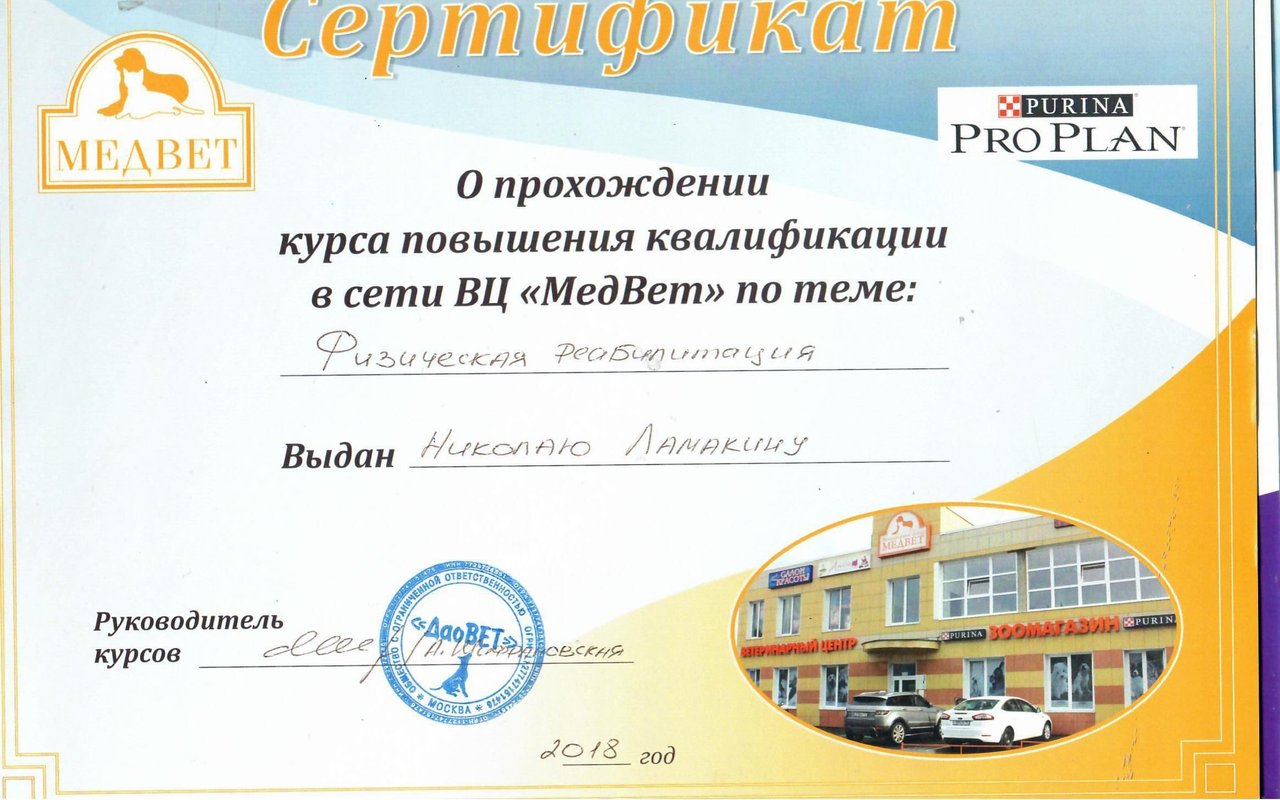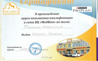2017 — В 2017 году прошел повышение квалификации по программе «Ветеринарная физическая реабилитация» Лекторы Чернявская А.В. и Курганская Н.И