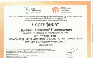 2018 — В 2019 году прошел курс повышения квалификации по теме: «Рентгенология, КТ и МРТ мелких домашних животных» клиника «Биоконтроль»