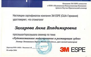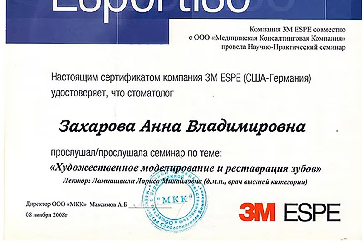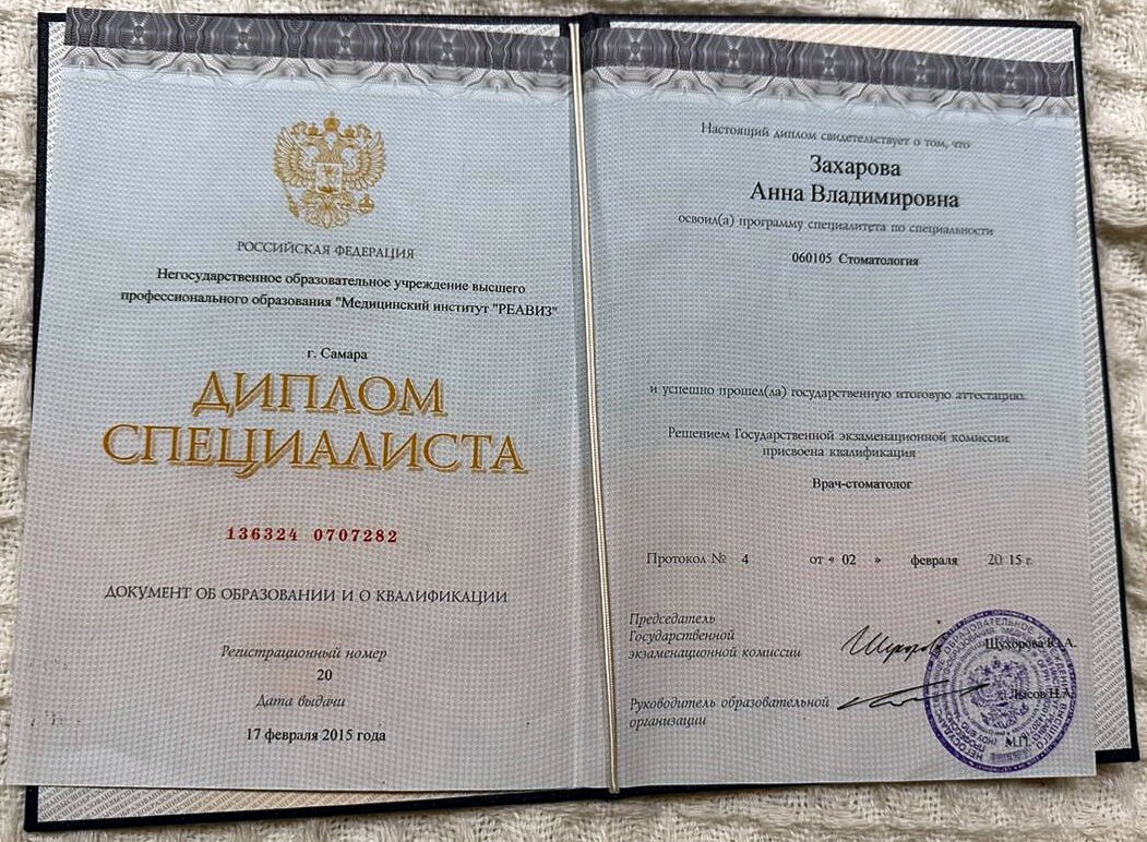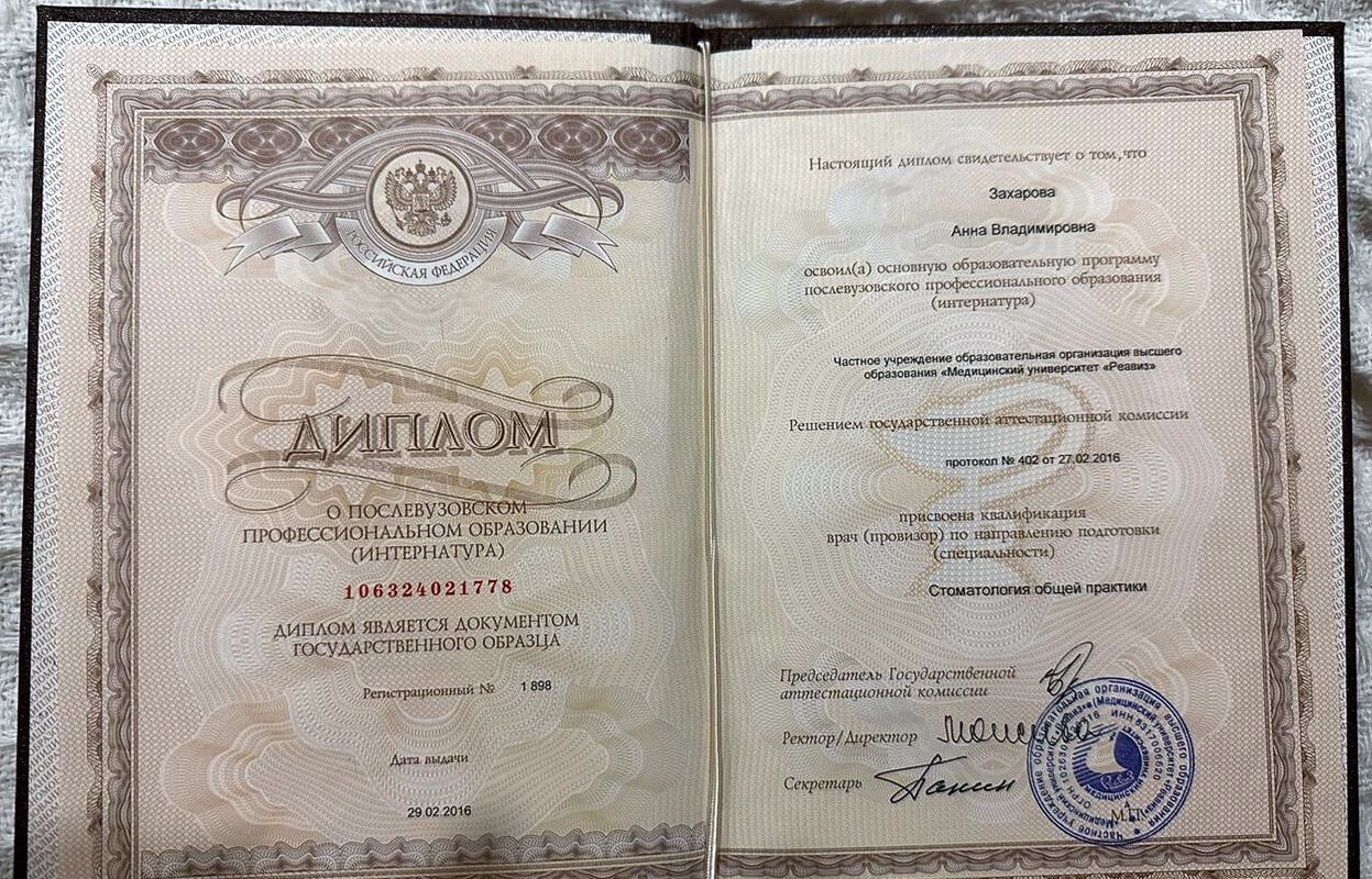 Захарова Анна Владимировна является стоматологом-ортопедом, а также работает в сфере стоматологической хирургии. Анна Захарова в том числе устанавливает металлокерамические и безметалловые протезы, вкладки и условно-съемные протезы, обладает знаниями и навыками в области эстетической пародонтологии, а также специализируется на заболеваниях полости рта.