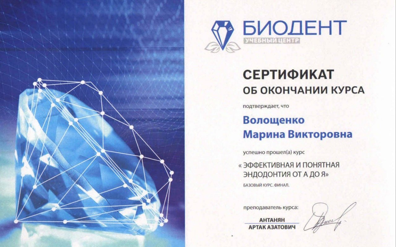 Марина Викторовна Волощенко — опытный стоматолог-терапевт с 11-летним стажем. Пациенты отмечают ее внимательность, деликатность и профессионализм. Она умеет создать комфортную обстановку, лечит аккуратно и без боли, благодаря чему пациенты доверяют ей и возвращаются снова. Врача рекомендуют за качественное обслуживание и заботу о клиенте.