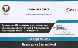 2017–2017 — Применение ботулотоксина в практике врача стоматолога.Лечение ВНЧС инъекциями гиалуроновой кислоты.3Д мезонити Скрыть