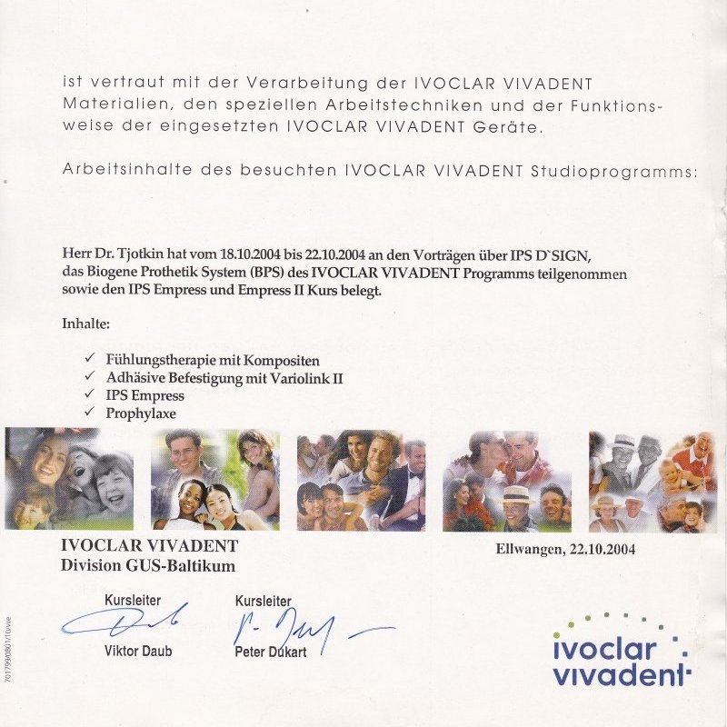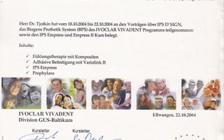 2004 — ICDE. IVOCLAR VIVADENT. Прошел обучение на тему: «Биогенное протезирование» по системе (BPS) des IVOCLAR VIVADENT.