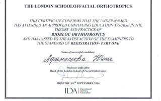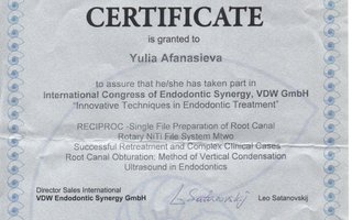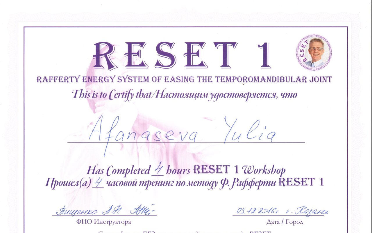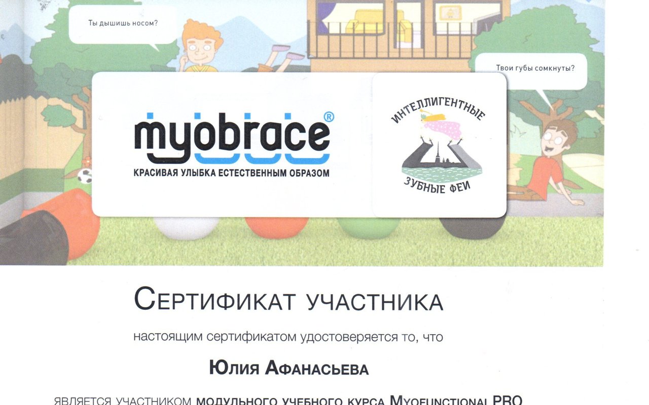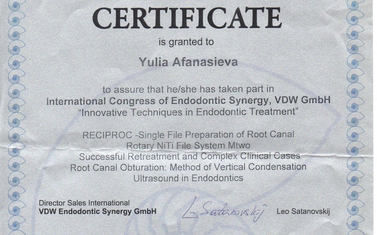 Афанасьева Юлия Викторовна является ортодонтом и стоматологом-ортопедом. Юлия Афанасьева в том числе выполняет установку функциональных ортодонтических аппаратов и микропротезирование зубов, проводит реминерализирующую терапию зубов, отбеливание зубов, ортодонтическое лечение с помощью LM-активатора и эндодонтическое лечение, а также обладает знаниями и навыками в области гнатологии.... Показать еще