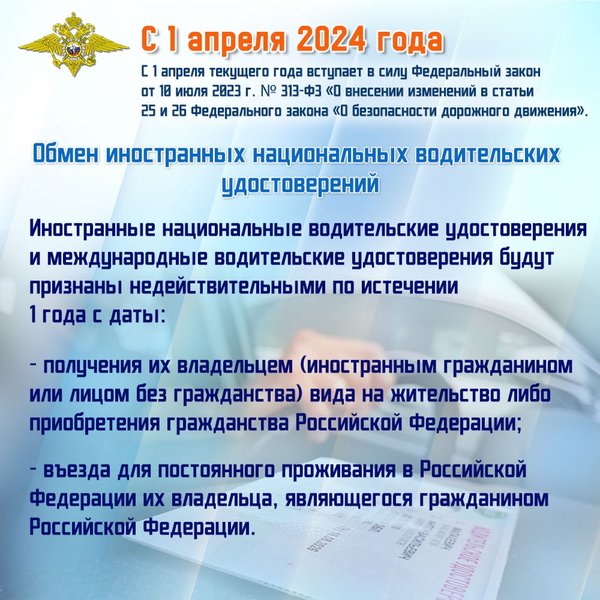 Министерство внутренних дел Российской Федерации (01.04.2024): Друзья, напоминаем, что 1 апреля 2024 года вступил в силу Федеральный закон от 10 июля 2023 г. № 313-ФЗ «О внесении изменений в статьи 25 и 26 Федерального закона «О безопасности дорожного движения», согласно которому меняется порядок обмена иностранных водительских удостоверений. Также вступили в силу изменения в Федеральный закон от 10 декабря 1995 г. № 196-ФЗ «О безопасности дорожного движения» и в Правила проведения экзаменов на право управления транспортными средствами и выдач… — Читать дальше