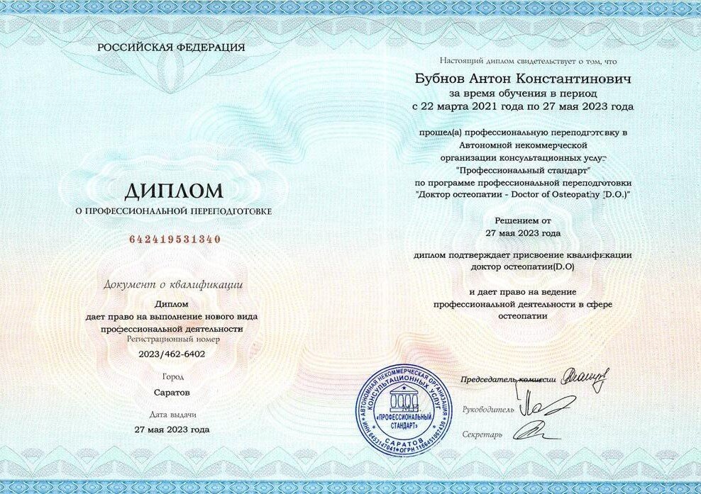 2021–2023 — AНОКУ "Профессиональный стандарт", г.Саратов - профессиональная переподготовка по программе "Доктор остеопатии - Doctor of Osteopathy (D.O)"