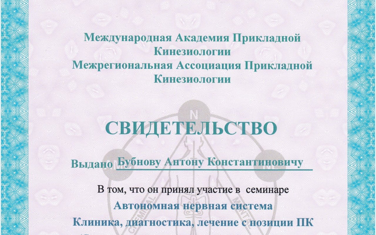 2023–2023 — AНОКУ "Профессиональный стандарт", г.Саратов - профессиональная переподготовка по программе "Доктор прикладной кинезиологии - Doctor of Applied Kinesiology (D.A.K)"