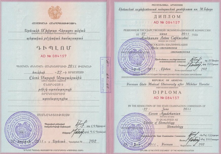 2011 — Ереванский государственный медицинский университет имени М. Гераци, врач-стоматолог