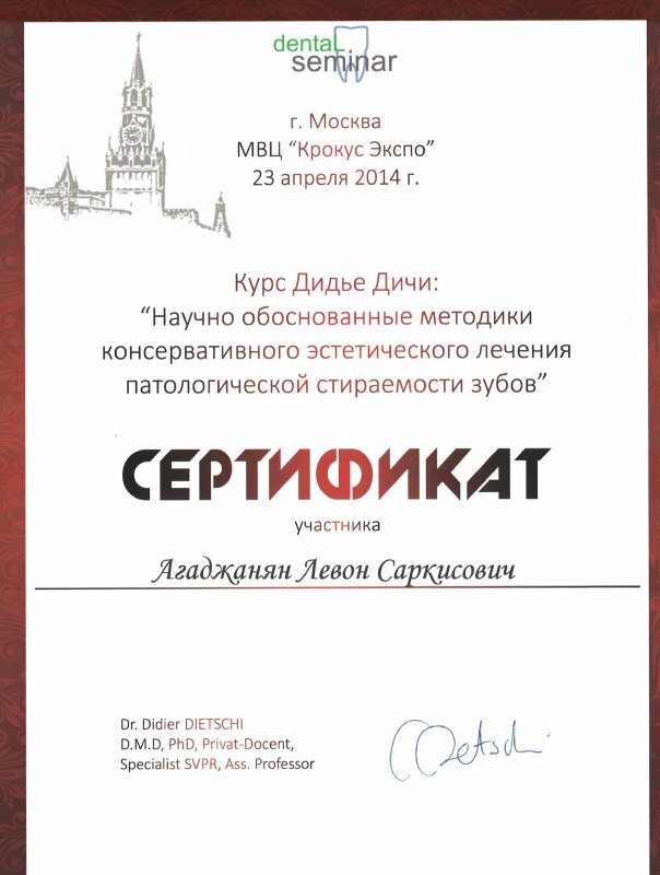 2014 — Научно обоснованные методики консервативного эстетического лечения патологической стираемости зубов. Дидье Дичи