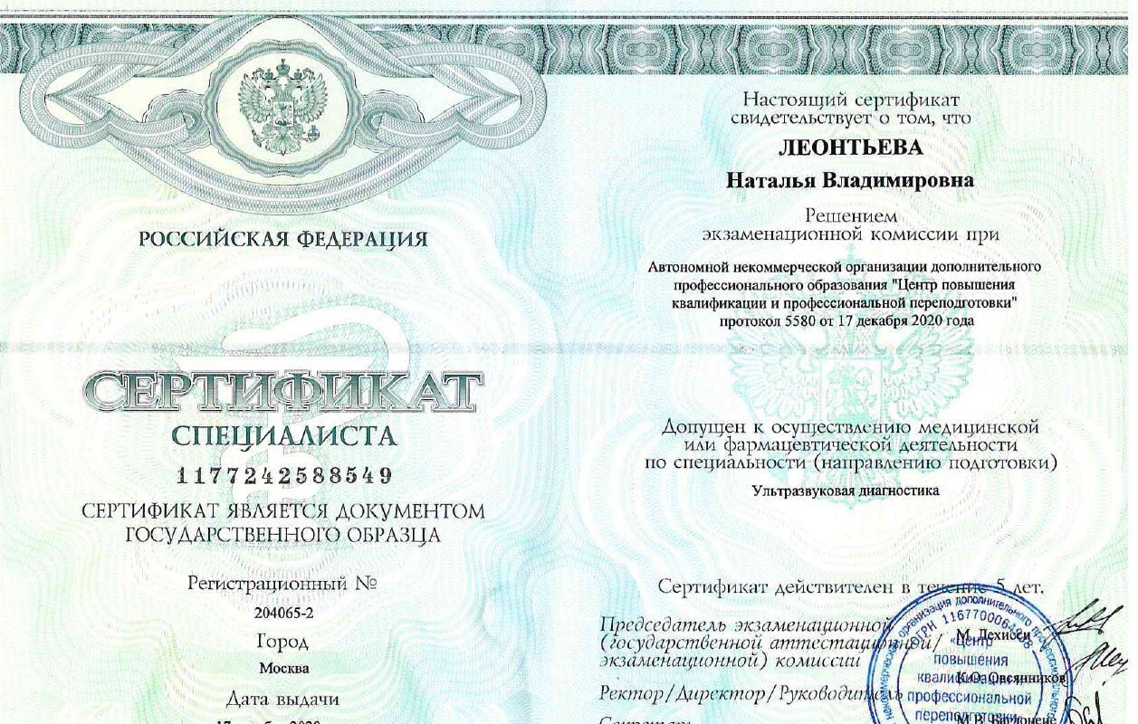 2020 — Программа «Ультразвуковая диагностика", АНО ДПО "Центр повышения квалификации" (г.Тюмень)
