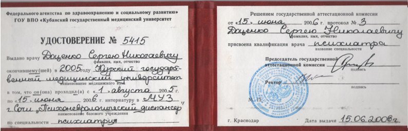 2006 — ГОУ ВПО «Кубанский государственный медицинский университет», специальность «Психиатрия» (г. Краснодар)