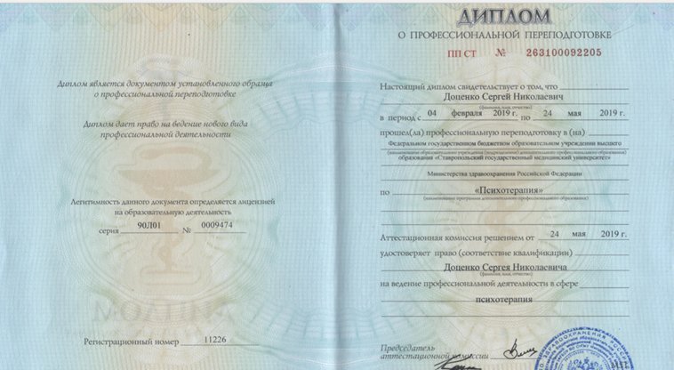 2019 — Программа «Психотерапия», ФГБОУ ВО «Ставропольский государственный медицинский университет» (г. Ставрополь)