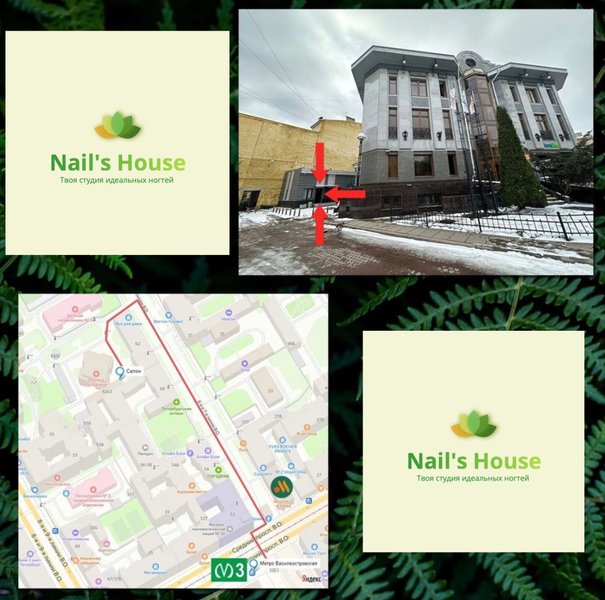 Мы находимся в 2-х минутах от станции метро Василеостровская. Вы можете воспользоваться фото с указателем как идти до нас от метро, либо же ввести в картах Яндекс наше название и карта проложит вам маршрут, а так же в любой момент нам позвонить и мы с радостью вам подскажем дорогу до нас. С нетерпением ждем встречи, ваш Nail's House!