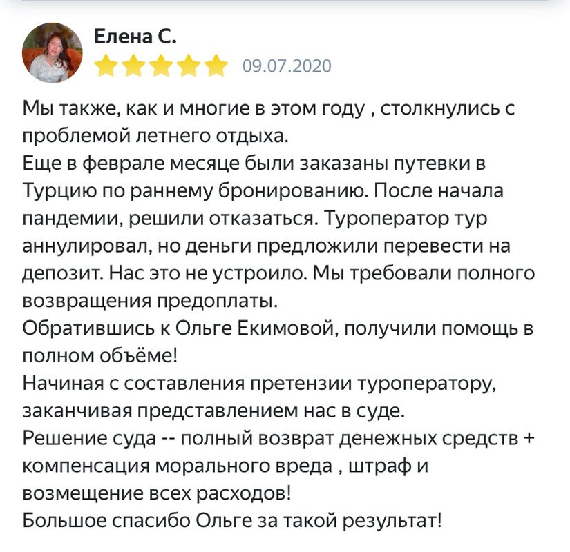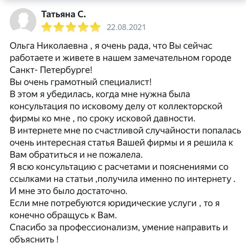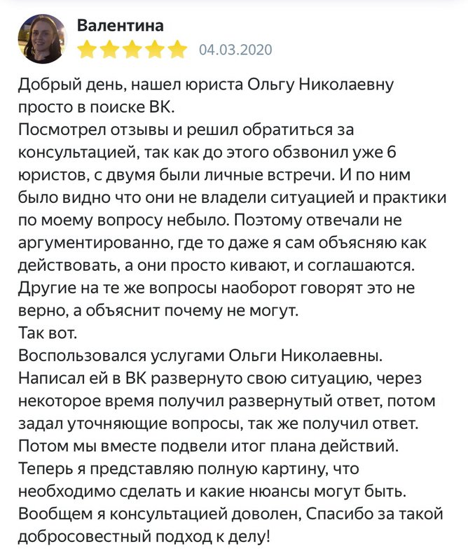 Ольга Николаевна — эксперт в юридических вопросах. Неоднократно обращалась по различным судебным вопросам: раздел имущества, порядок установки общения родителей с детьми, житейские проблемы — спор с сервисом по ремонту авто и тд. На все интересующие вопросы всегда получаю четкие ответы и стратегию. Смело рекомендую Ольгу Николаевну своим знакомым и друзьям.