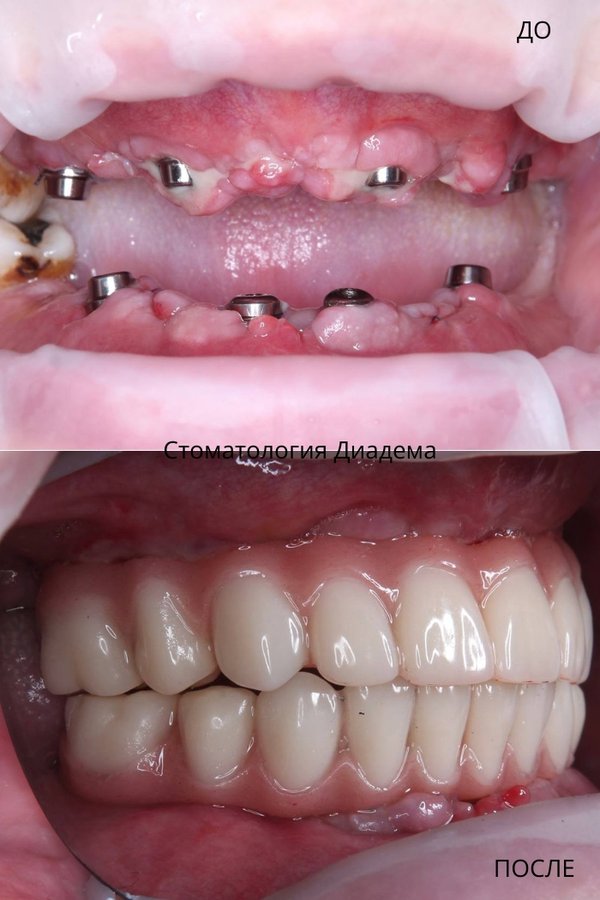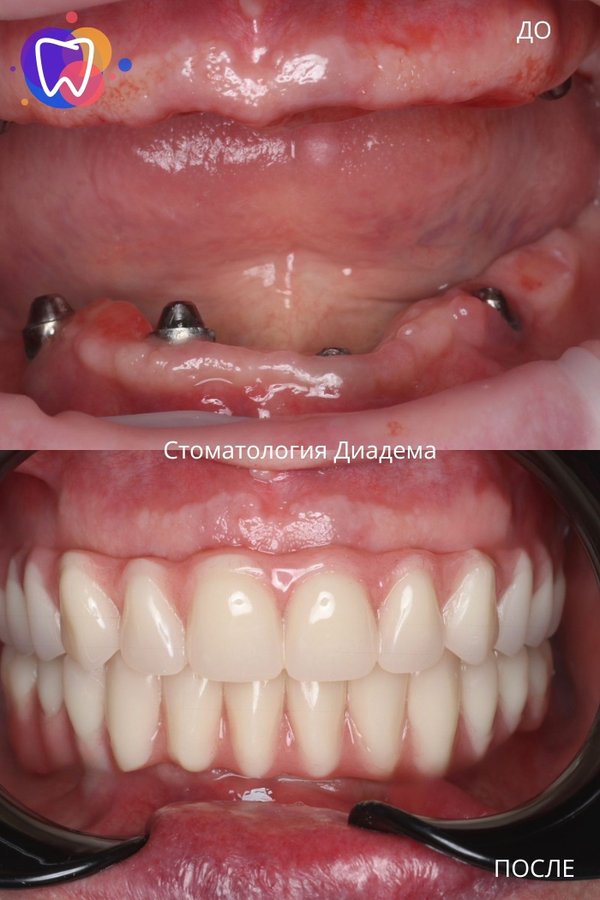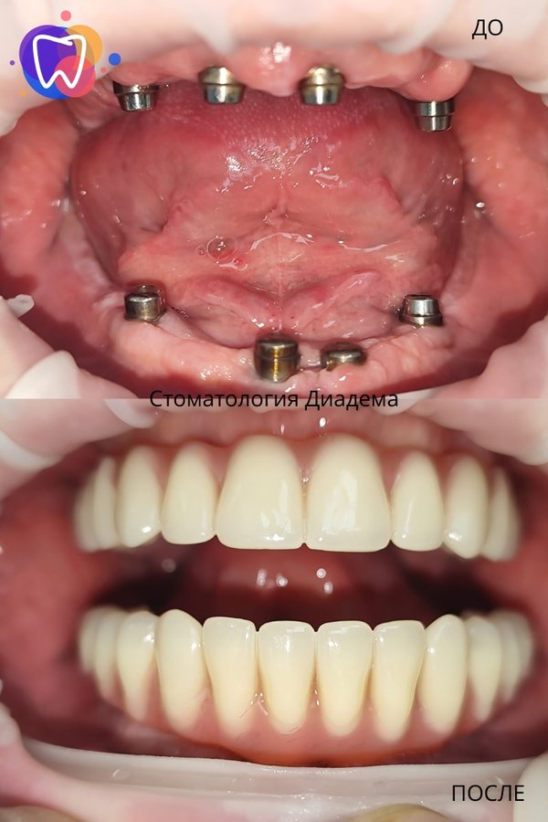 иента сделать зубы, которые будут служить долгие годы и выполнять своих функции в полном объёме, без дискомфорта и осложнений. Выбирайте клинику и врача грамотно, не экономьте на данном виде протезирования, переделки работ стоят намного дороже, чем сделать все хорошо с первого раза. Клиника Диадема имеет в штате опытных врачей, специализирующихся на полном восстановлении зубов и весь спектр необходимого оборудования. Ежедневного проводим от 5 до 7 операций All on 4. All-on-4 — это система протезирования на имплантах “Все на четырех”, направленная на полное восстановление верхнего и нижнего зубного ряда при полной или множественной адентии. Для записи на приём к опытным врачам хирургам и ортопедам, со стажем более 20 лет, звоните: