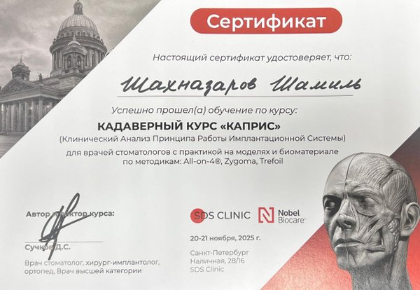 тельствах, включая имплантацию зубов любой сложности, и использует в своей практике только проверенные и доказательно эффективные методы. Шамиль Ибрагимович стремится не только восстановить функциональность зубного ряда, но и подарить уверенность в себе и красивую улыбку каждому пациенту. Только за 2025, Шамиль Ибрагимович прошел множество курсов по методике «Все на 4» у лучших стоматологов мира. 1. «All-on-4®: Хирургический и ортопедический протокол» — официальные курсы от Nobel Biocare по системе All-on-4. 2. «Альтернативные концепции полной реабилитации с использованием имплантатов» — курсы, предлагающие другие подходы к полной реабилитации беззубой челюсти. 3. «Планирование и навигационная хирургия All-on-4» — использование цифровых технологий для планирования и проведения операции All-on-4. Так же врач обладает уникальной методикой установки скуловых имплантатов: — Кадаверный курс «КАПРИС» — Nobel Biocare И помогает множеству пациентов обрести зубы, когда им отказали в других клиниках. Для записи на приём, звоните:, администратор подберет удобное время для получения консультации по Вашему случаю. В рамках консультации будет сделан КТ снимок (без оплаты) и составлен индивидуальный план лечения с ценой и сроками.