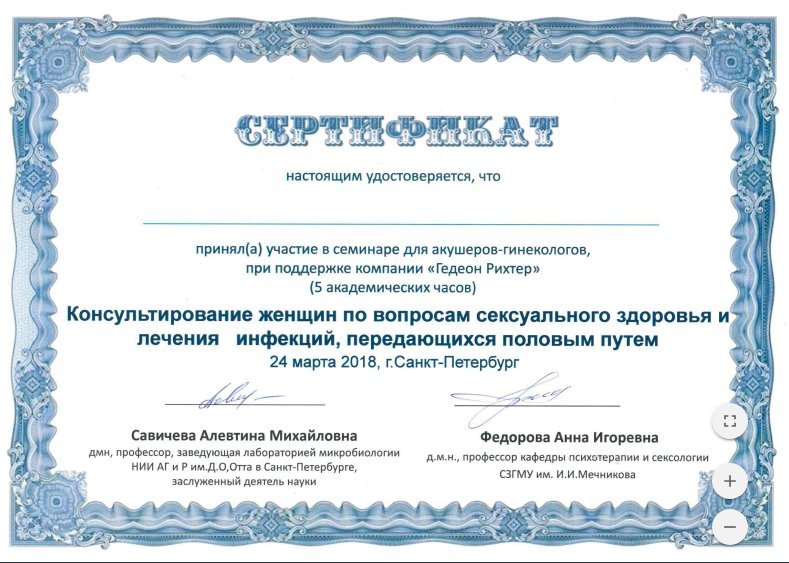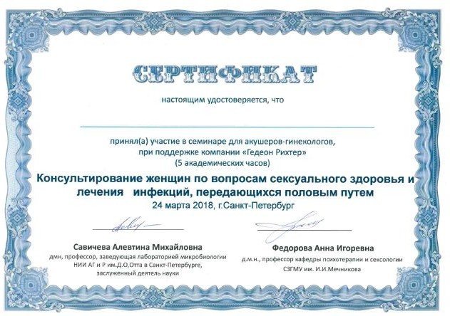2018 — Сертификат участника семинара для акушеров - гинекологов "Консультирование женщин по вопросам сексуального здоровья и лечения инфекций, передающихся половым путем" Санкт - Петербург