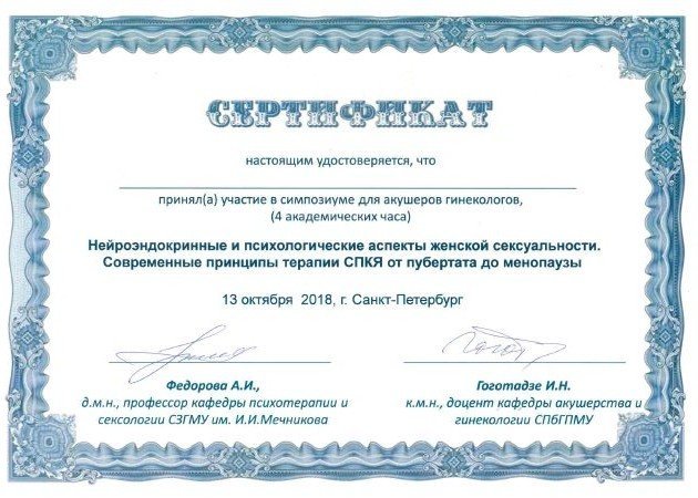 2018 — Сертификат участника симпозиума для акушеров гинекологов "Нейроэндокринный и психологические аспекты женской сексуальности. Современные принципы терапии СПКЯ от пубертата до менопаузы" Санкт — Петербург