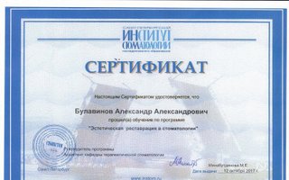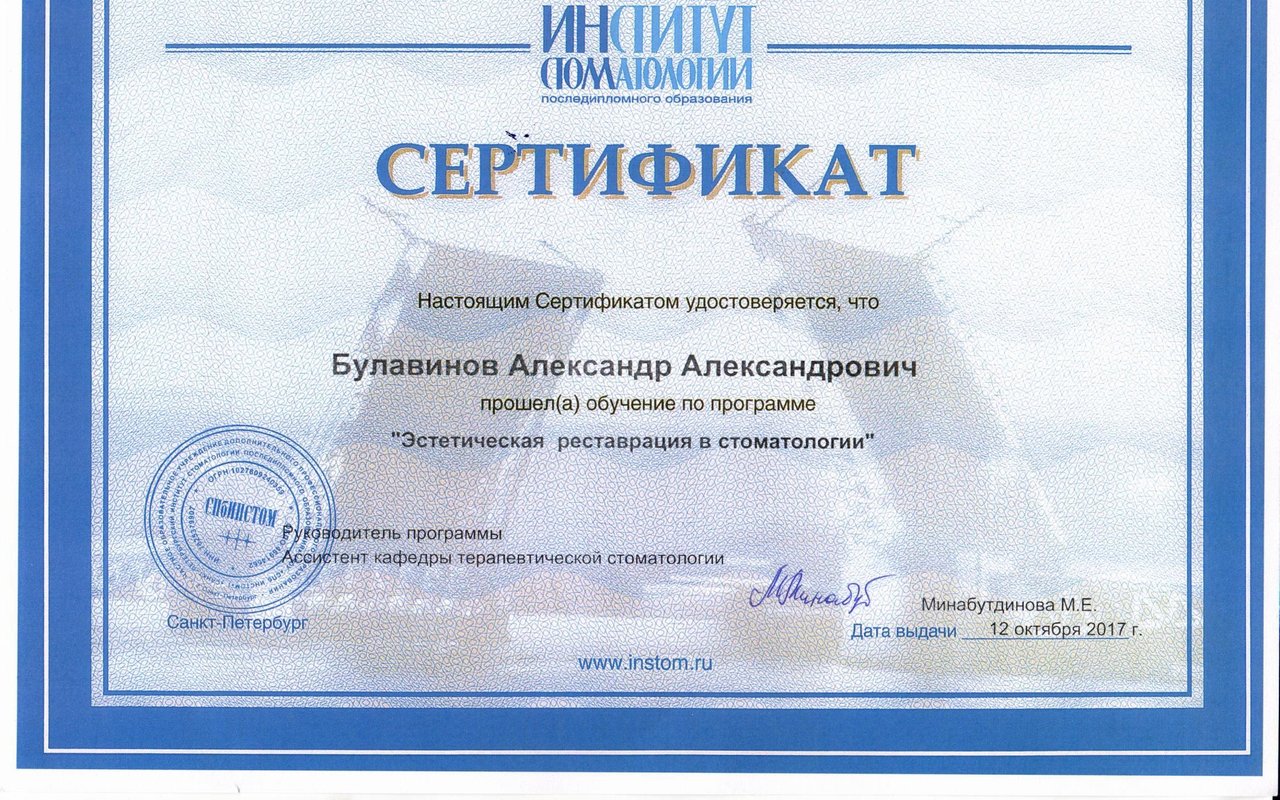 Прошел программы повышения квалификации на базе Института стоматологии СПб по направлениям: