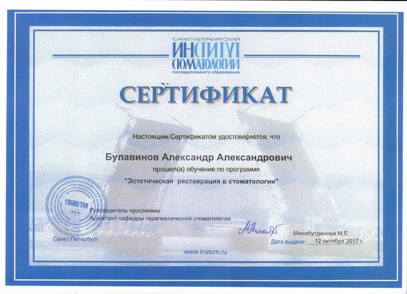 2017 г. первичная специализация «Стоматология терапевтическая» Институт стоматологии, Санкт-Петербург