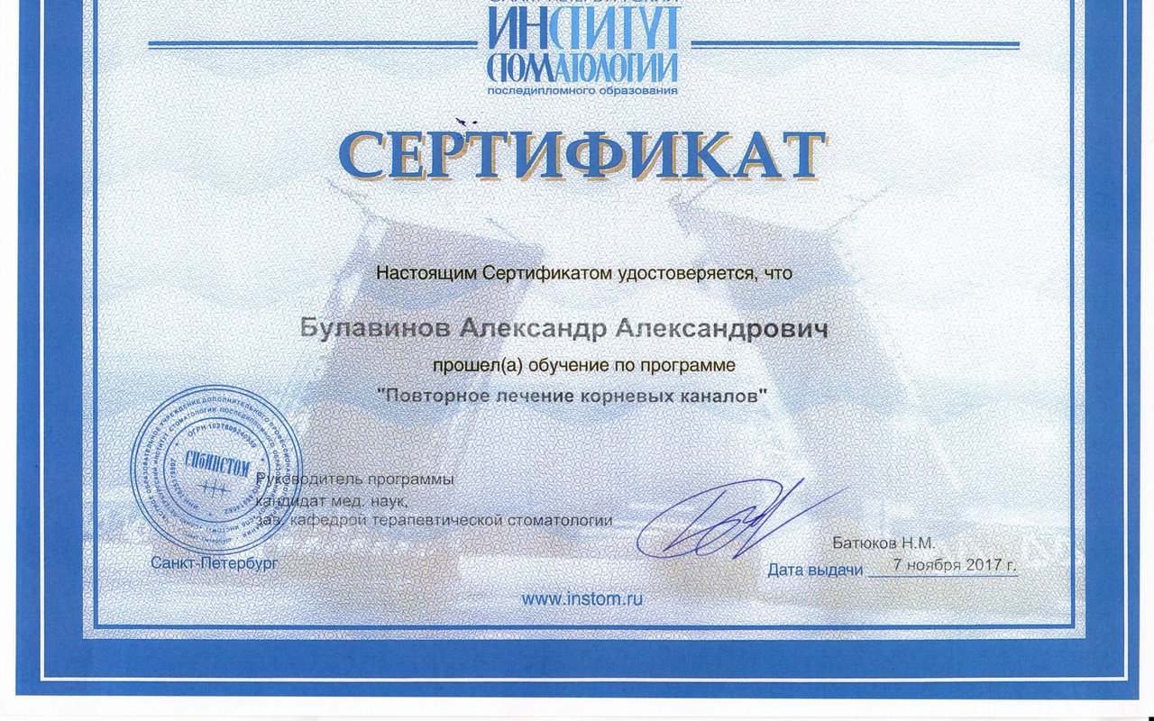 2012 г. - «Практическая эндодонтия» (курс Болячина), Институт стоматологии, Санкт-Петербург