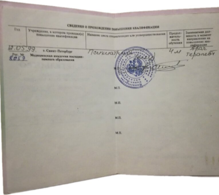 1999 — Санкт-Петербургская Медицинская академия последипломного образования (МАПО) (психиатрия)