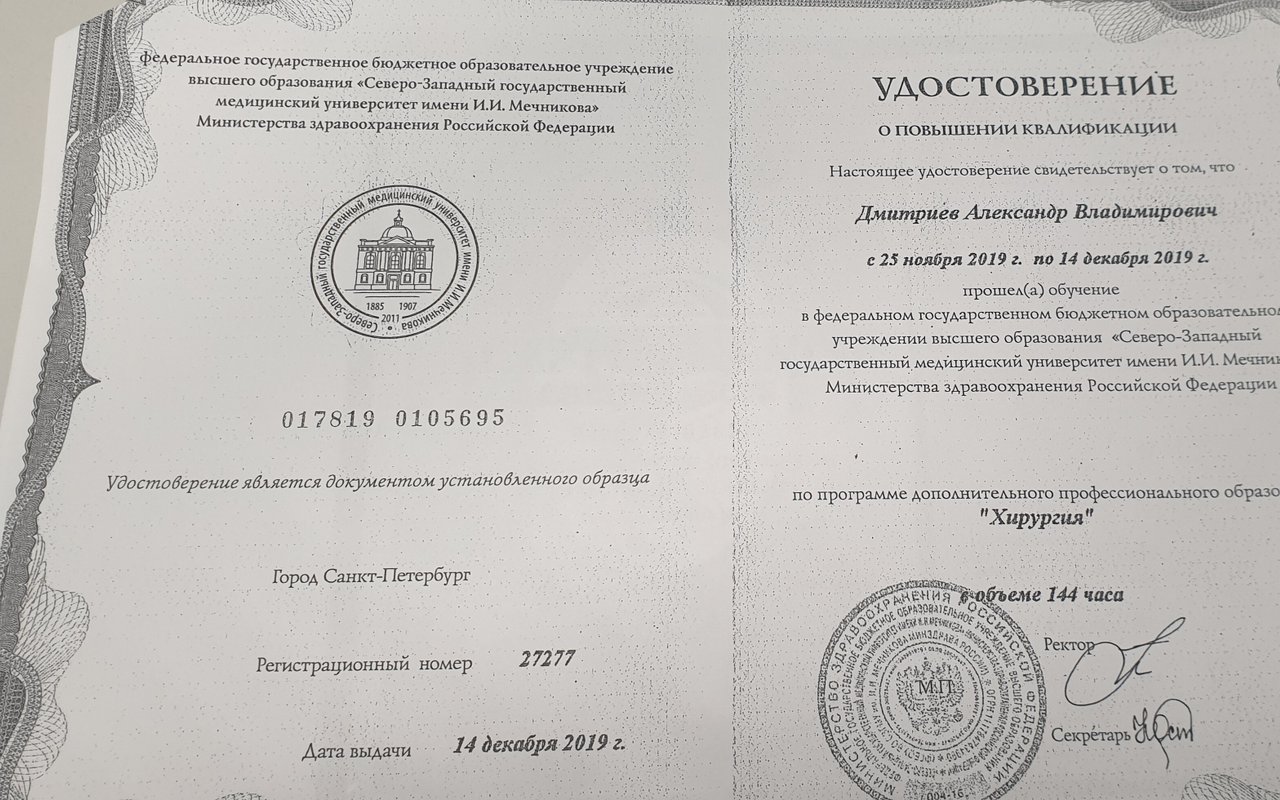 2001 — Прошел клиническую ординатуру при ГОУ ДПО "Санкт-Петербургская медицинская академия последипломного образования" по специальности "Хирургия"