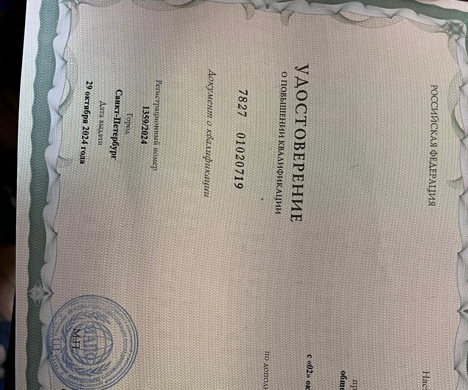 1998 — ФГБО УВО "Санкт-Петербургский государственный педиатрический медицинский университет" Минздрава РФ по специальности "Педиатрия"