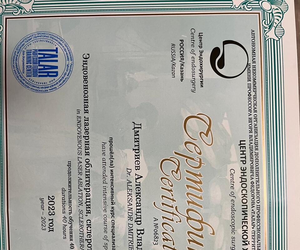 Александр Владимирович в совершенстве владеет современными методиками безоперационного лечения варикозной болезни, такими как ЭВЛК (эндовазальная (эндовенозная) лазерная коагуляция вен), склеротерапия, минифлебэктомия.