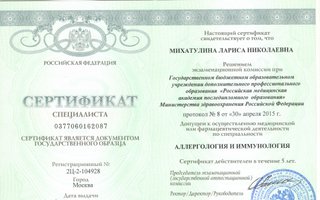 Сертификат «Аллергология и иммунология» действителен до 2020г