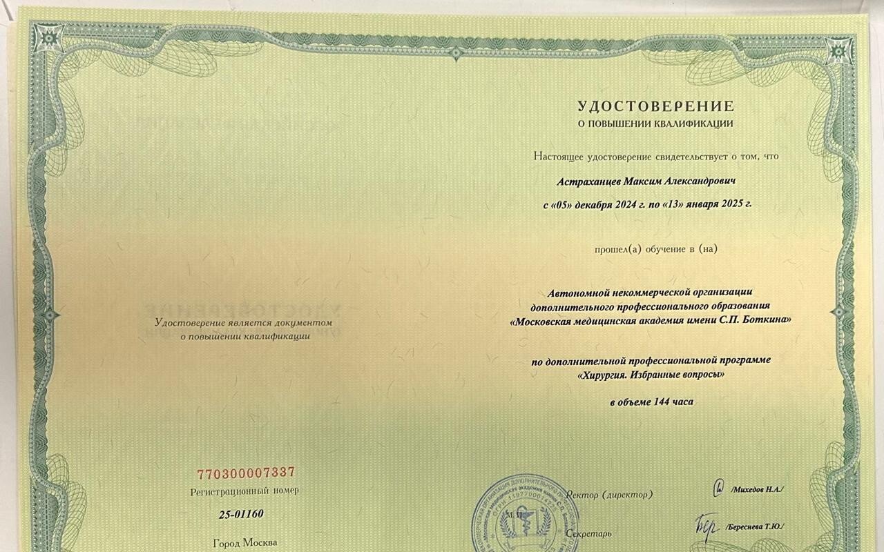 2018 — Профессиональная переподготовка по специальности "Хирургия" на базе "Национальный медико-хирургический центр имени Н.И. Пирогова"