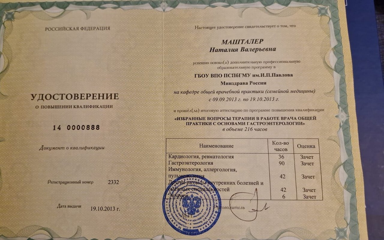2013 — ГБОУ ВПО ПСПбГМУ им. И.П. Павлова Минздрава России "Избранные вопросы терапии в работа врача общей практики с основами гастроэнтерологии"