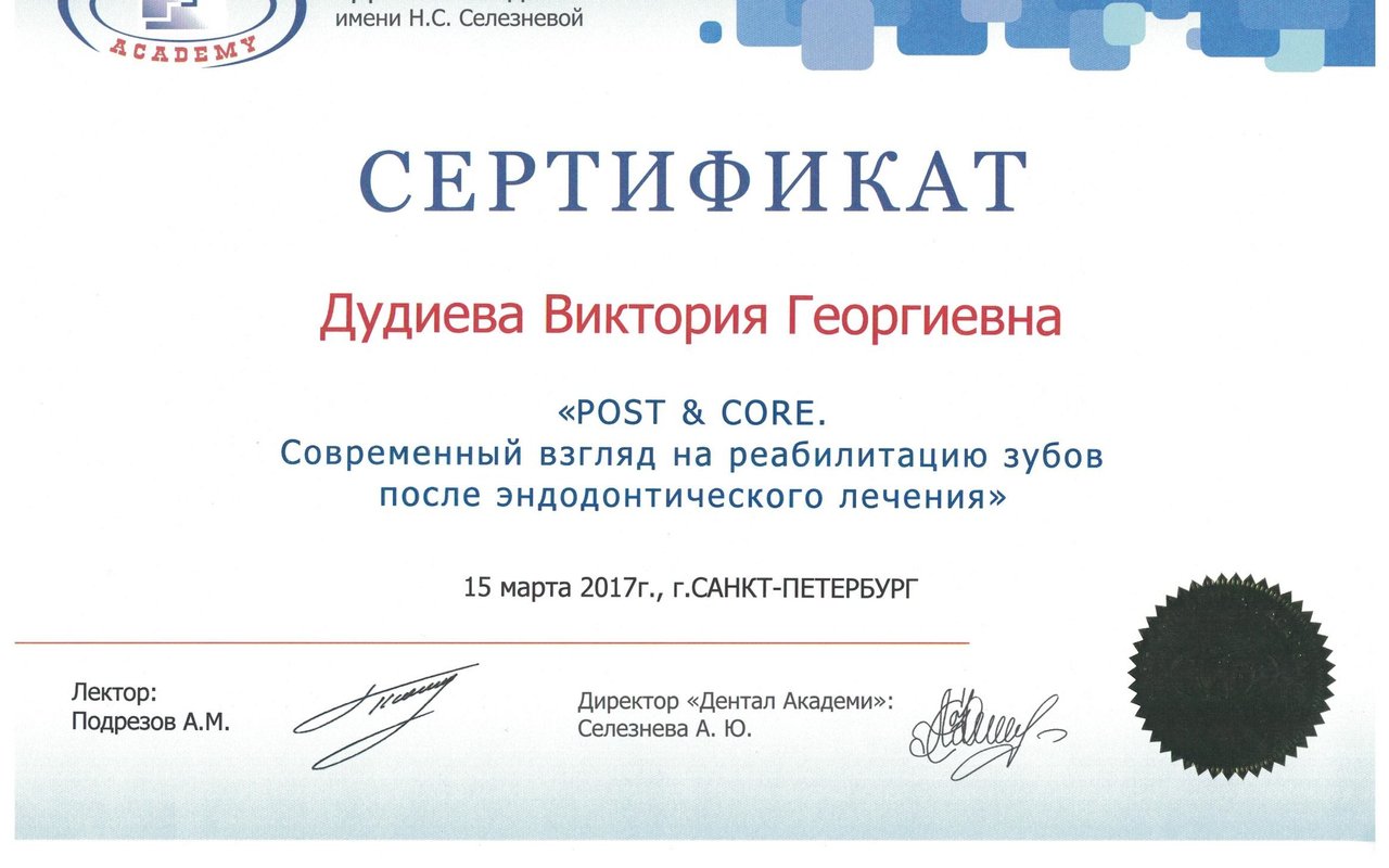 2017 — Современный взгляд на реабилитацию зубов после эндодонтического лечения. "Дентал Академи" им. Н.С. Селезневой
