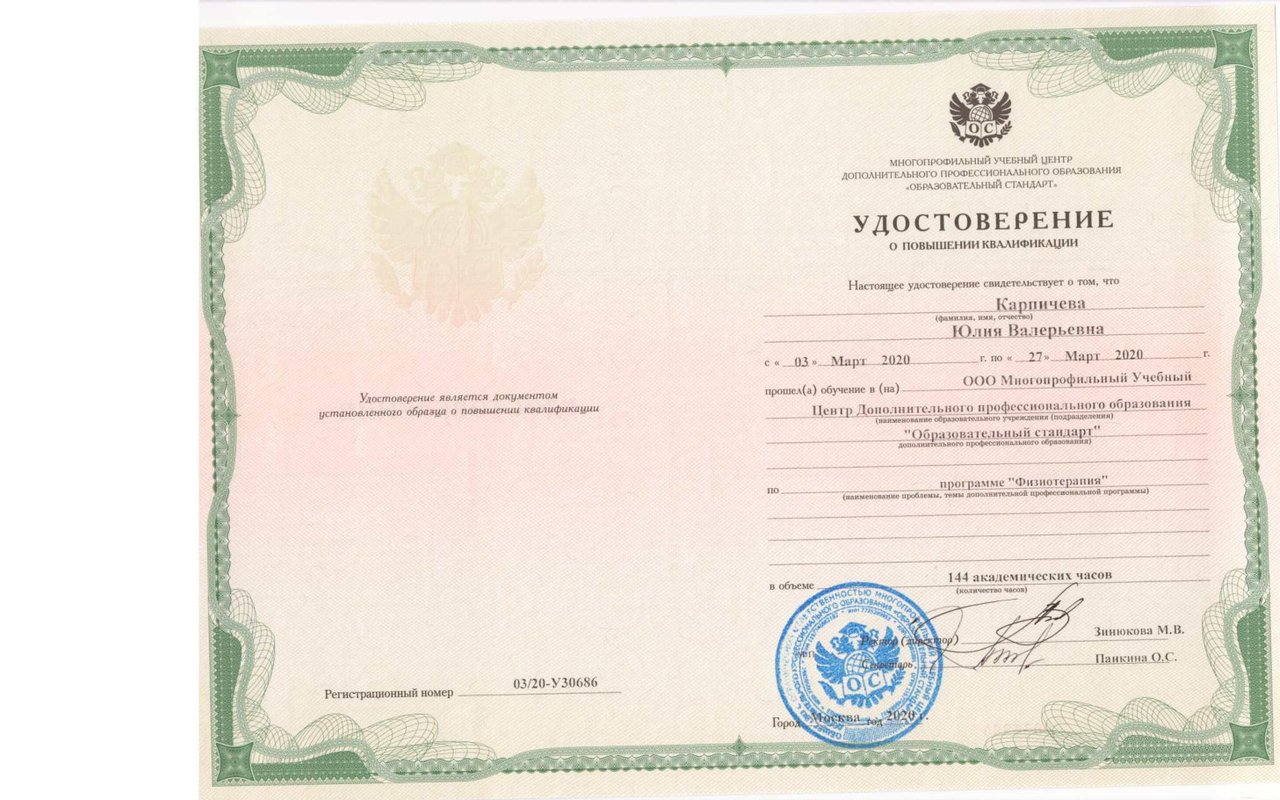 Юлия Валерьевна Карпичева — опытный и внимательный специалист с 20-летним стажем. Пациенты отмечают её профессионализм, доброжелательное отношение и способность быстро помогать при болях и проблемах со спиной. Она внимательно слушает и успешно проводит лечение, что вызывает доверие и благодарность.