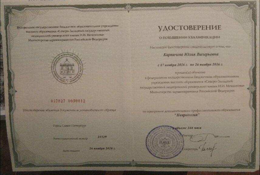 2016 — "Актуальные вопросы неврологии", ФГБОУ ВО «Северо-Западный государственный медицинский университет им. И.И. Мечникова»