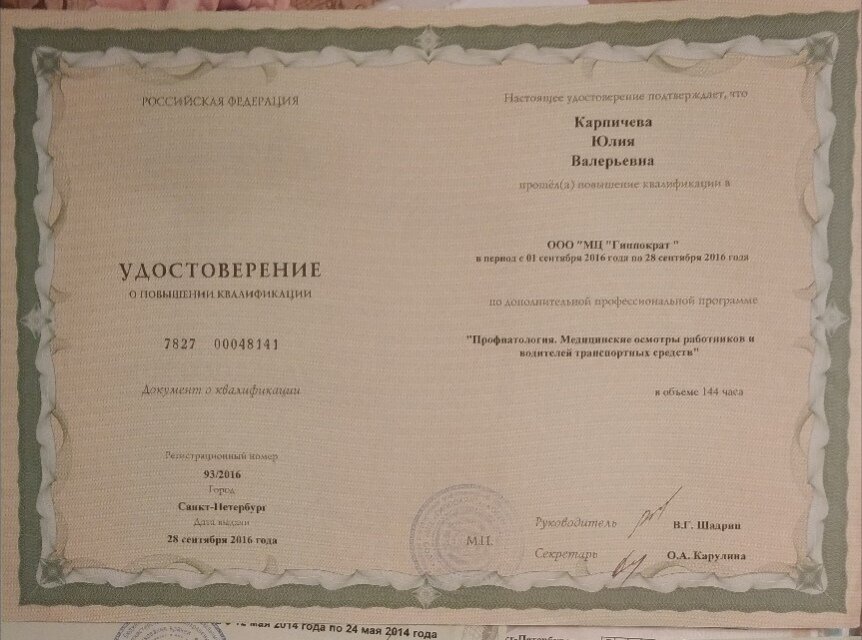 - Есть ли у Карпичевой Юлии Валерьевны требуемые сертификаты?