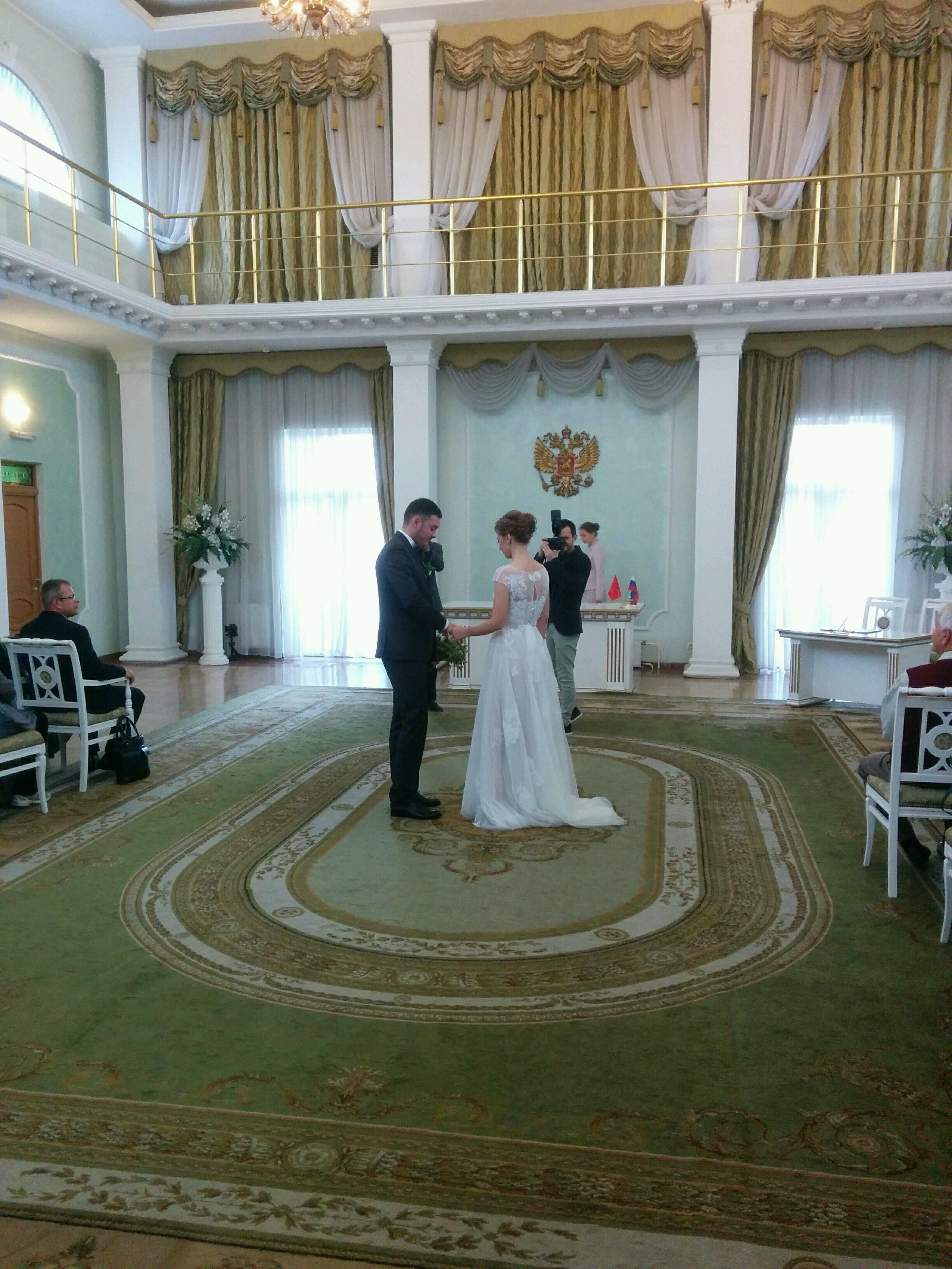 зала ожидания для гостей. Залы распределяются в день свадьбы и по количеству гостей. Шикарная лестницы с серым ковром (ранее он был по-моему красным). На втором этаже зал бракосочетания и комната ожидания новобрачных, где перед росписью проводили фотосессию и отдавали паспорта. Потом плавно из комнаты ожидания перешли в коридорчик, где наши гости уже нас ожидали и зашли в зал бракосочетания. Это очень классно! Нам все понравилось! Спасибо работникам за организацию таких моментов, все было спокойно, без спешки. Девушки были вежливые, улыбчивые и в белых/светлых костюмах. На выходе разрешили посыпать новобрачных.