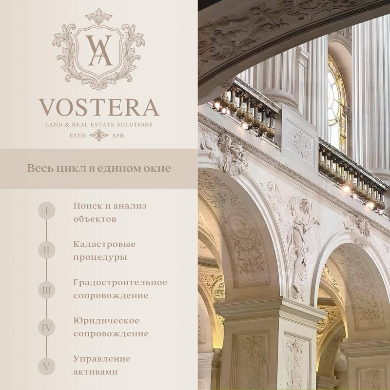 VOSTERA — бутик персональных решений в сфере земли и недвижимости. Компания сопровождает проекты полного цикла: помогает собственникам земли и недвижимости навести порядок в правовом и градостроительном статусе актива и довести проект до дохода.