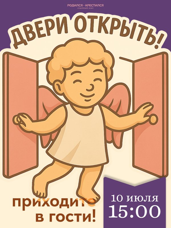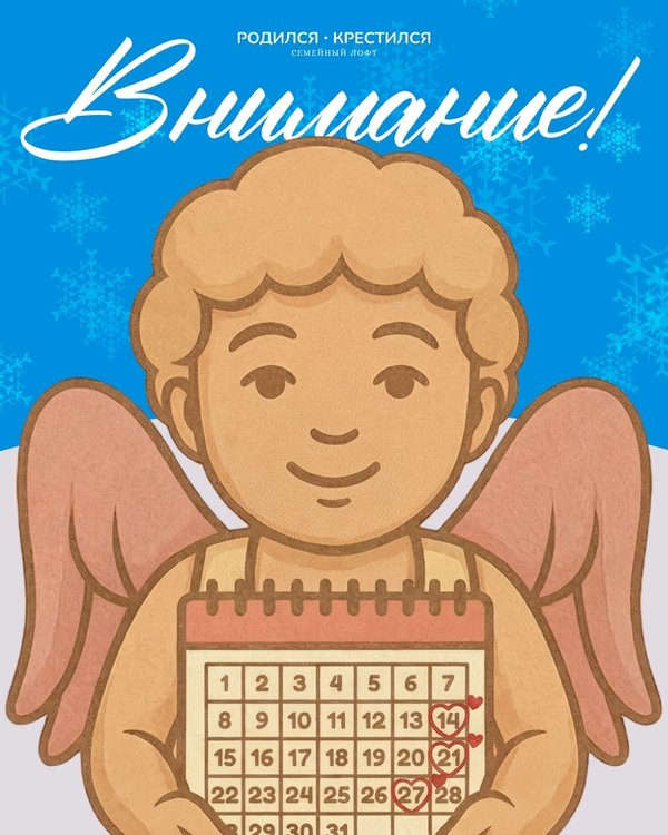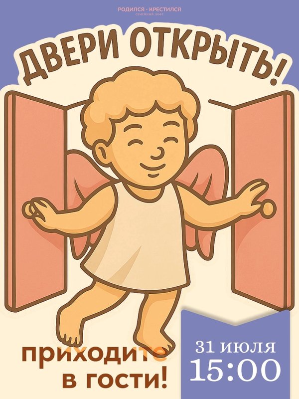 скажем о новом конкурсе. Следите за новостями! Также в июле мы снова в гостях у родильного дома № 1. Такие добрые визиты теперь отмечаем в календаре голубым кружком — например, как 3 июля. ️ И не забудьте: 31 июля — вторая дата Дня открытых дверей этого месяца. Подробности — ближе к событию. ⸻ Адрес: Санкт-Петербург, 2-я линия В.О., 13/6 Контакты: Ангел Родился Крестился | ️Важно: • Даты 9, 16, 19 и 26 июля заняты — бронируйте другие дни заранее! • Новые мероприятия появляются регулярно — следите за обновлениями.