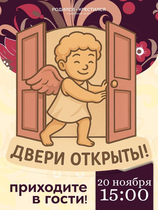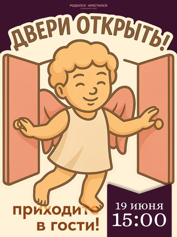 День открытых дверей в “Родился-крестился” — приходите всей семьёй! 19 июня С 15:00 до 19:00 ждём вас в нашем семейном лофте на Васильевском острове — познакомиться, пообщаться, провести уютный вечер вместе. Что вас ждёт: Чай, печеньки и угощения Игровая комната для малышей Комната матери и младенца Атмосфера — тёплая, семейная, настоящая А ещё — два мастер-класса: 16:00 — лепим забавных зверюшек из пластилина 18:00 — создаём свечи своими руками Вход свободный! Но просим заранее зарегистрироваться: Каждого маленького гостя ждё… — Читать дальше