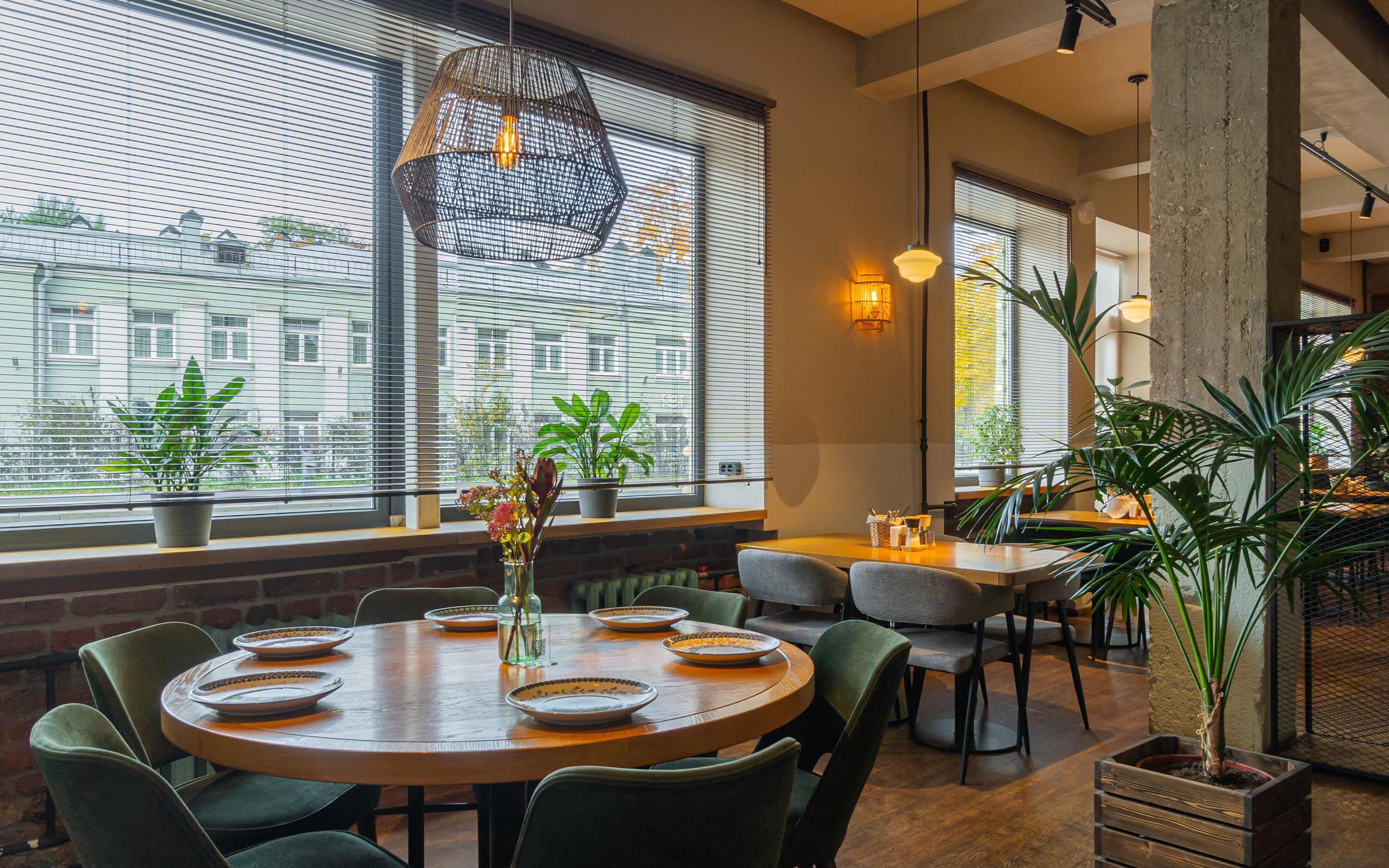 Светлый зал ресторана Теплые края оформили в стиле лофт с кирпичными стенами и дополнили яркими деталями: натуральным деревом, мягкими оранжевыми подушками, живыми растениями, изображениями фруктов. Для маленьких гостей есть просторная детская комната